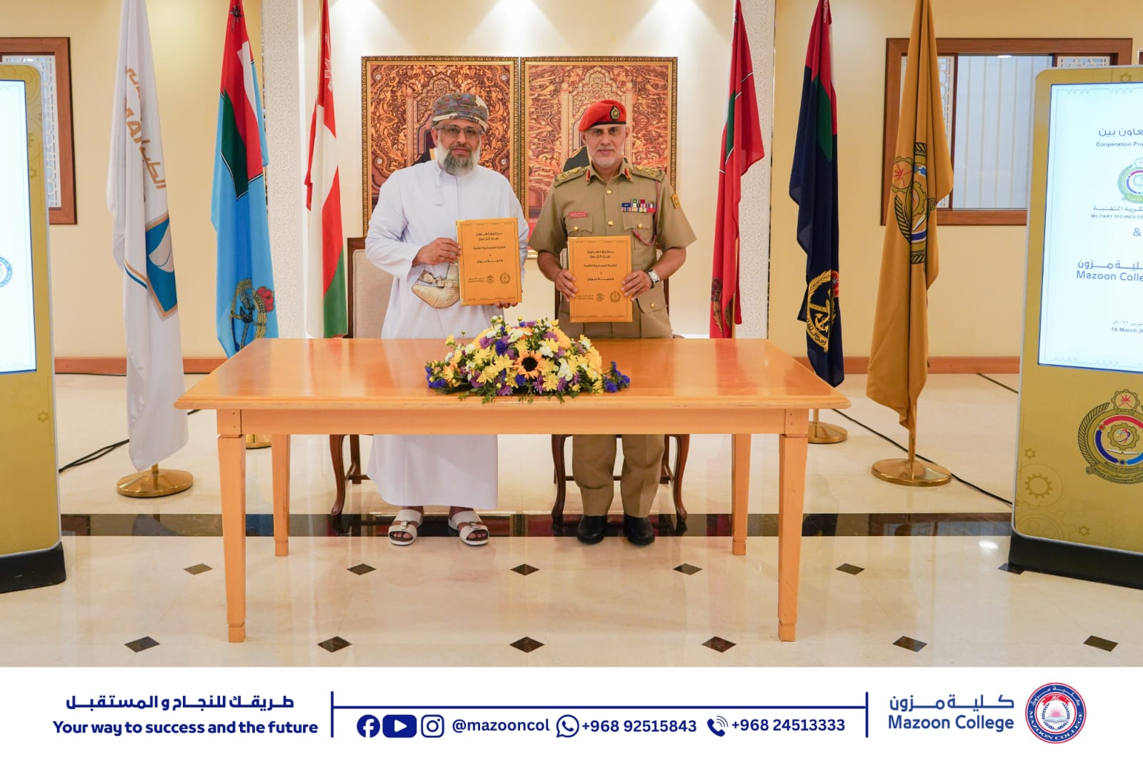 وقع الاتفاقية كل من الدكتور / حمود بن عامر الوردي عميد كلية مزون و العميد الركن الدكتور / أحمد بن خلفان الحديدي عميد الكلية العسكرية التقنية.